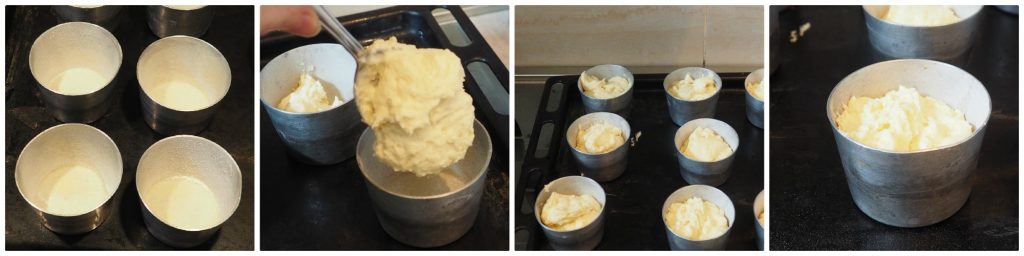 Beurrez des caissettes (les miennes mesurent 5,5 cm de hauteur et 7,5 cm de diamètre), saupoudrez-les de farine et mettez-y une bonne cuillerée de mélange. Cela doit remplir environ deux tiers de la caissette.