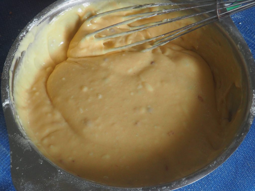 Dans un autre bol, mélangez la farine avec la vanilline et la levure, tamisez-les et ajoutez-les au mélange d’œufs. Battez bien avec un fouet, en essayant d’incorporer de l’air, le mélange doit être légèrement mousseux et lisse.