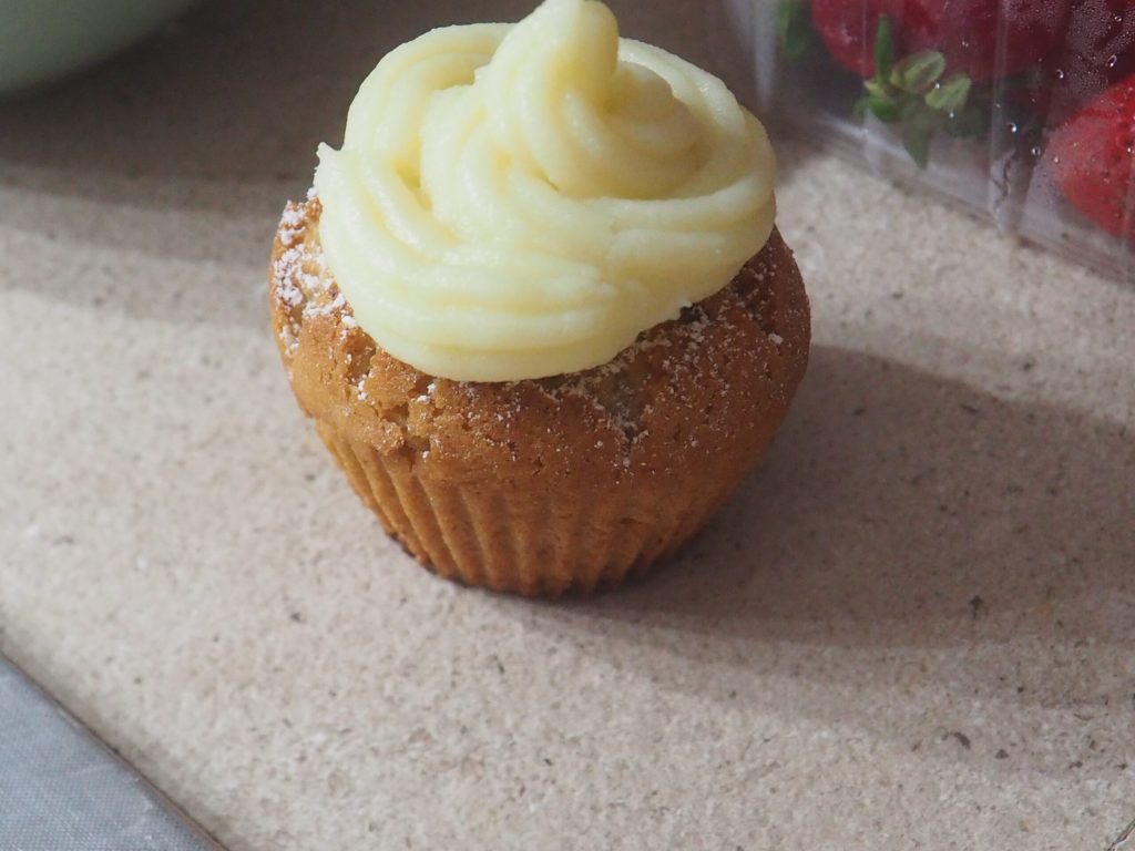 • Mettez la crème pâtissière restante dans une seringue pour pâtisserie et décorez la surface des muffins. Placez une petite fraise sur chaque muffin.
