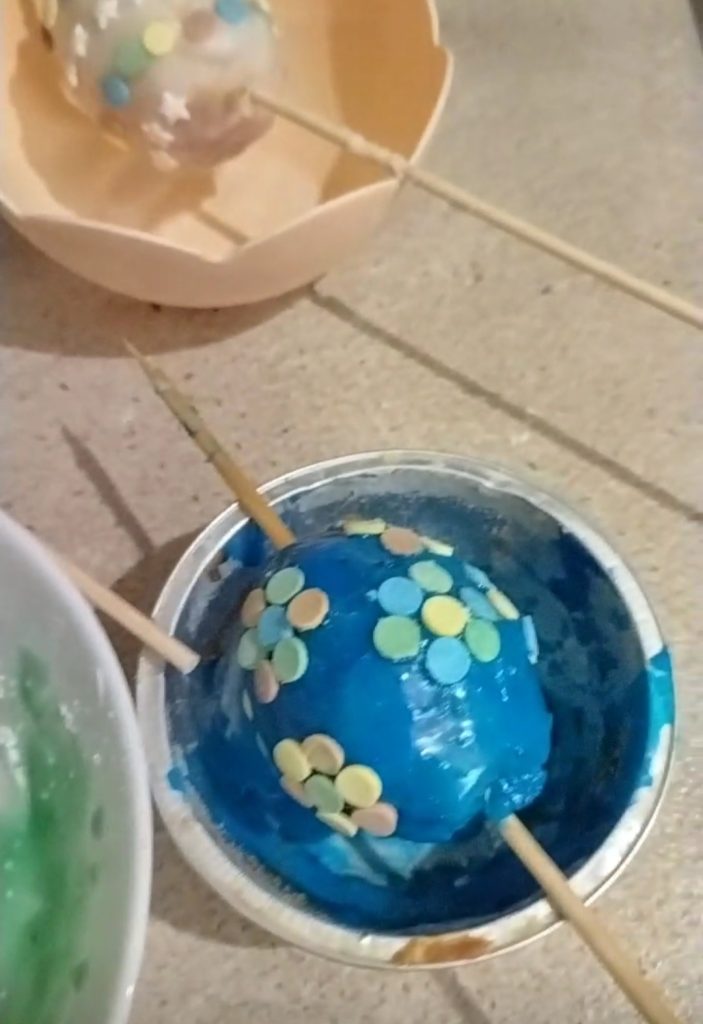 Dans l’un des trois bols, j’ai mis du colorant bleu, procédez comme pour le glaçage à l’eau blanc. Pour avoir une couleur plus vive, repassez les œufs dans le sucre deux ou trois fois. Appliquez ensuite des petits sucres colorés à votre convenance lorsque le glaçage est encore humide, ainsi ils tiendront mieux.