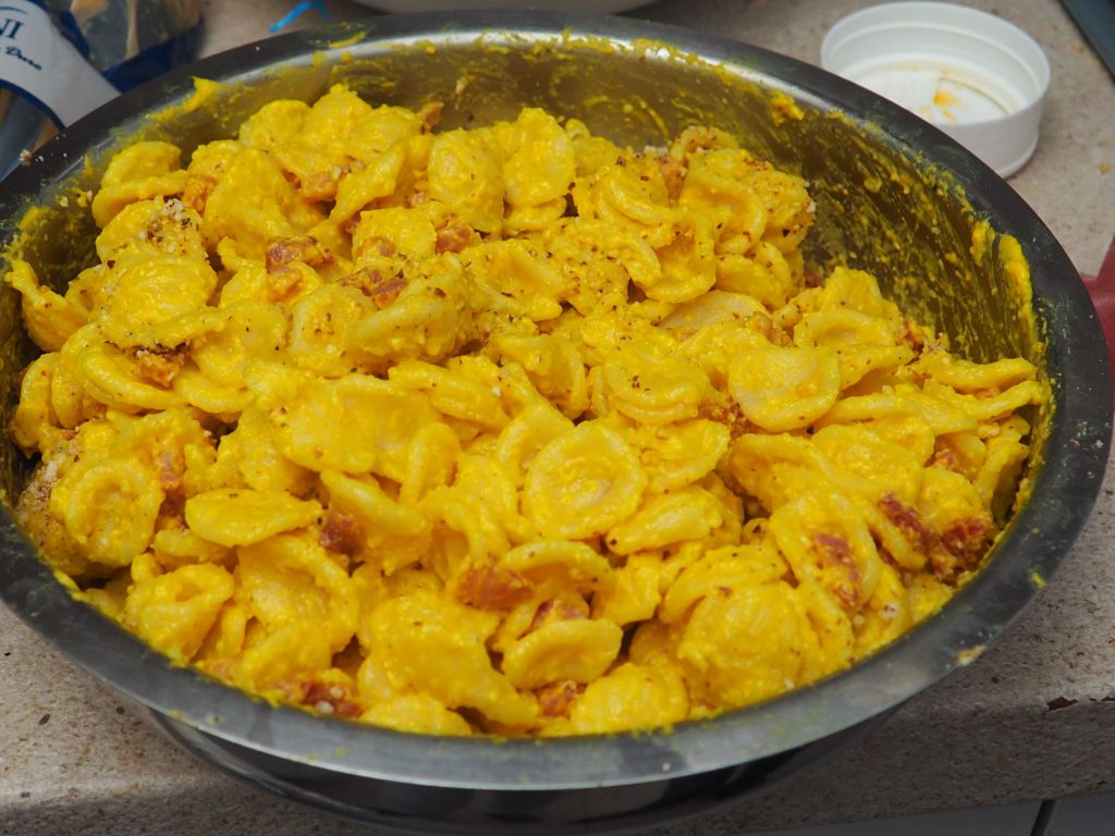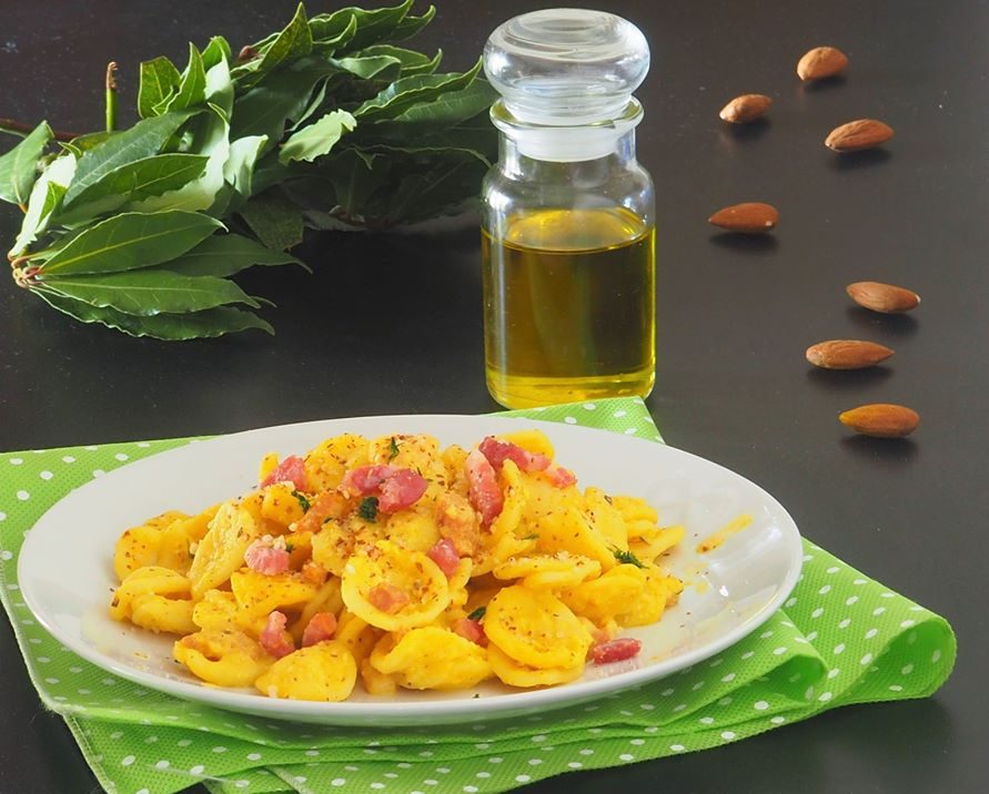 Les Orecchiette mascarpone, curcuma, pancetta sont nées un jour où je n’avais vraiment aucune idée de quoi préparer pour le déjeuner. Elles sont vraiment délicieuses, avec le goût de la curcuma qui se fait à peine sentir, la pancetta qui les assaisonne et une pincée d’amandes hachées qui les rend croquantes.