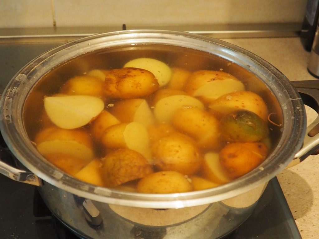Mettez dans une casserole une abondante quantité d’eau, dès qu’elle bout, salez-la et ajoutez les pommes de terre avec la peau préalablement lavées.