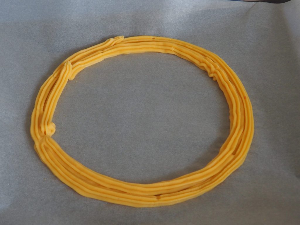 Mettez la pâte à choux dans une seringue avec une buse assez large en étoile et faites un cercle en suivant la circonférence dessinée. À côté du premier cercle, à l’intérieur, faites un second cercle.