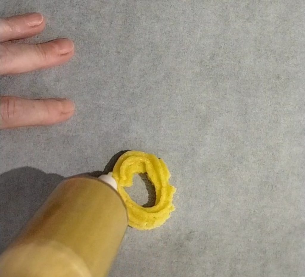 Sortez-la du frigo et remplissez peu à peu une seringue avec embout en étoile. Placez du papier sulfurisé sur une plaque du four et commencez à former les Pâtes de maïs.