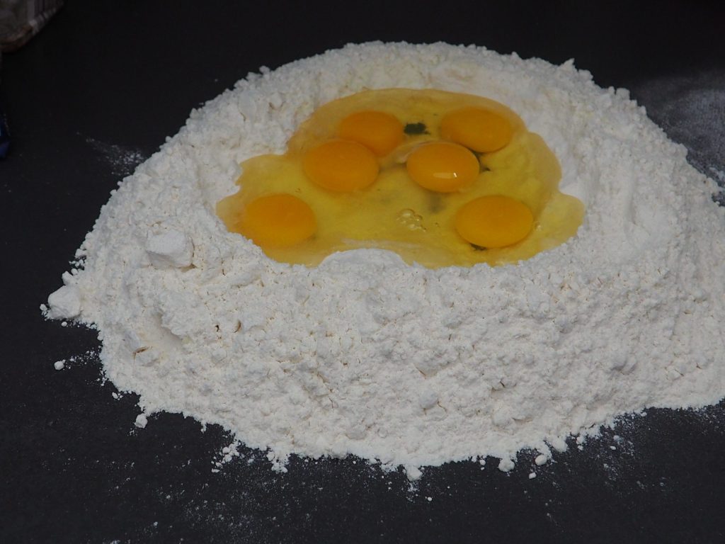 • Disposez la farine en fontaine sur un plan de travail, ajoutez au centre les 10 œufs.