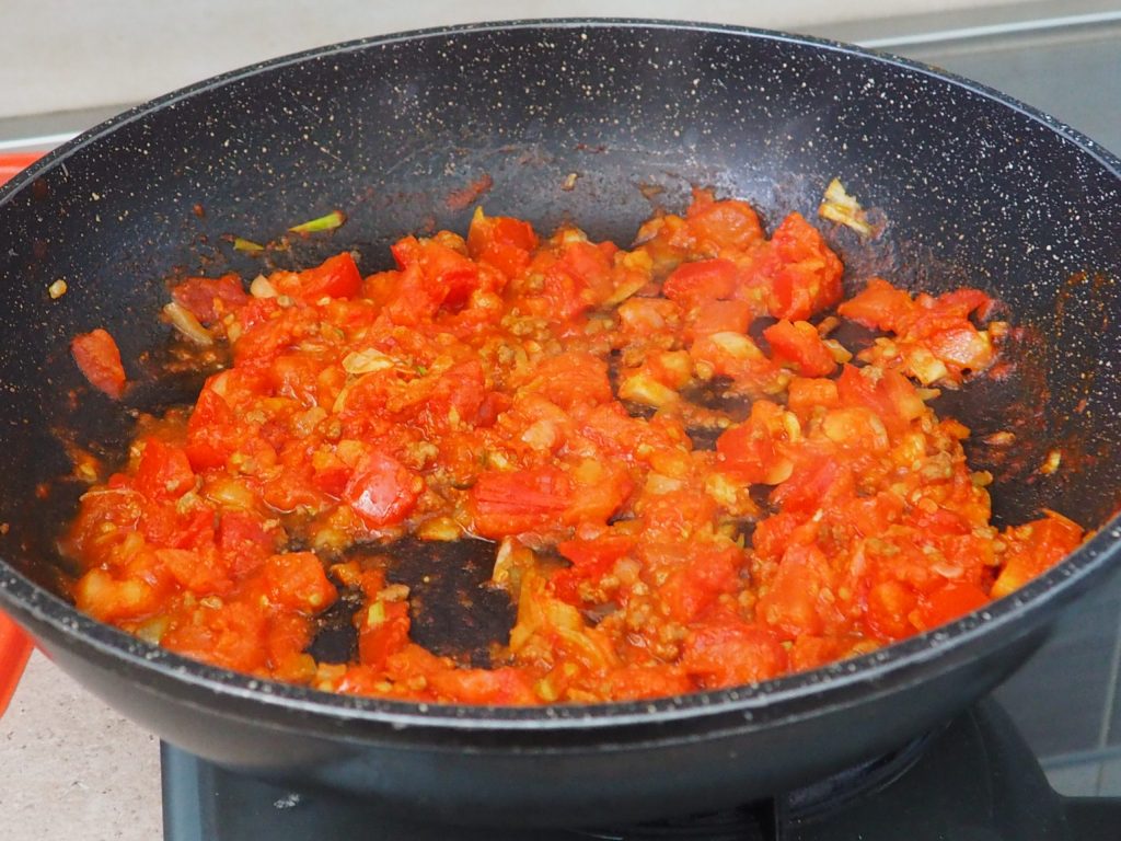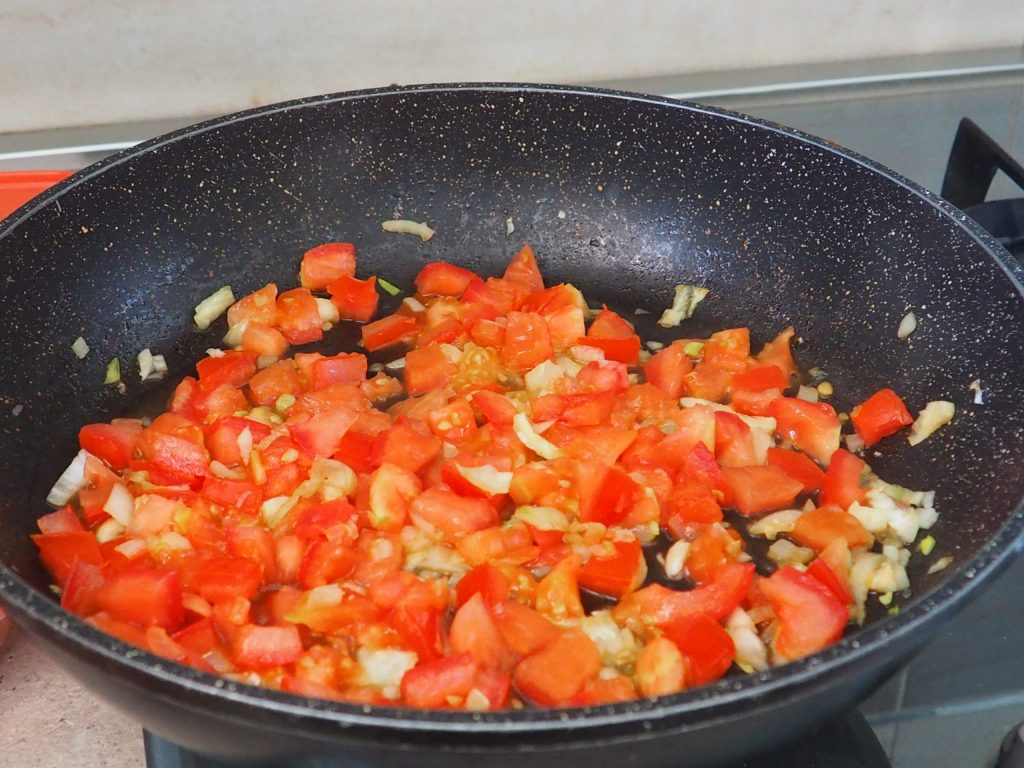 Dans une poêle, mettez l’huile d’olive, faites revenir l’oignon pendant quelques minutes, puis ajoutez les tomates.