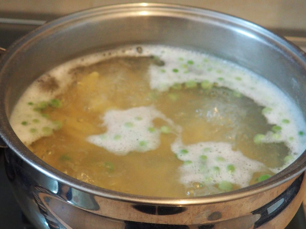 Mettez environ un demi-litre d’eau dans une casserole, versez les petits pois surgelés.