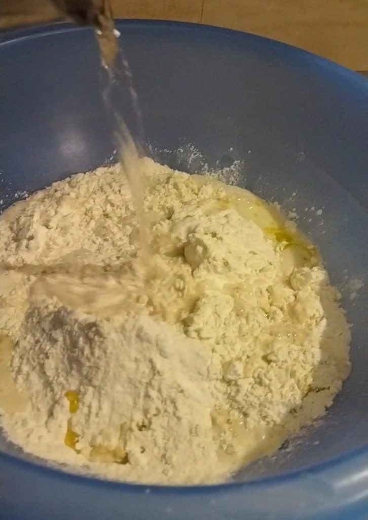 Ajoutez l’eau tiède, l’huile et le sel. Pétrissez jusqu’à obtenir une pâte homogène, elle sera légèrement collante.