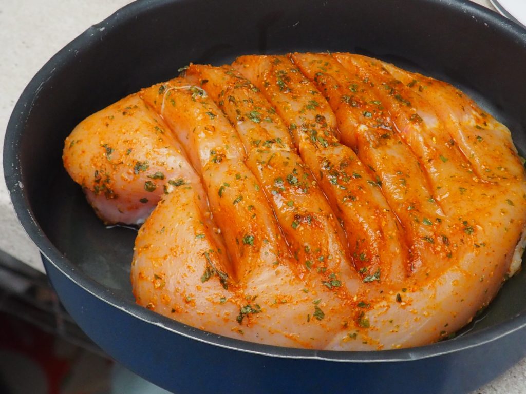 Préparez maintenant le mélange d’épices. Massez la poitrine de poulet avec un peu d’huile, salez-la puis étalez sur toute la surface le mélange d’épices.