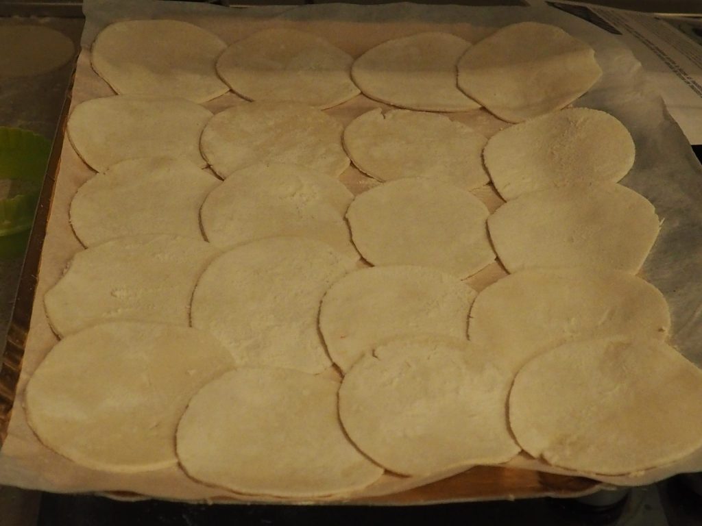 Avec un emporte-pièce de 8 cm de diamètre, découpez plusieurs disques (j’en ai obtenu 70/80) et placez-les sur un plan fariné.