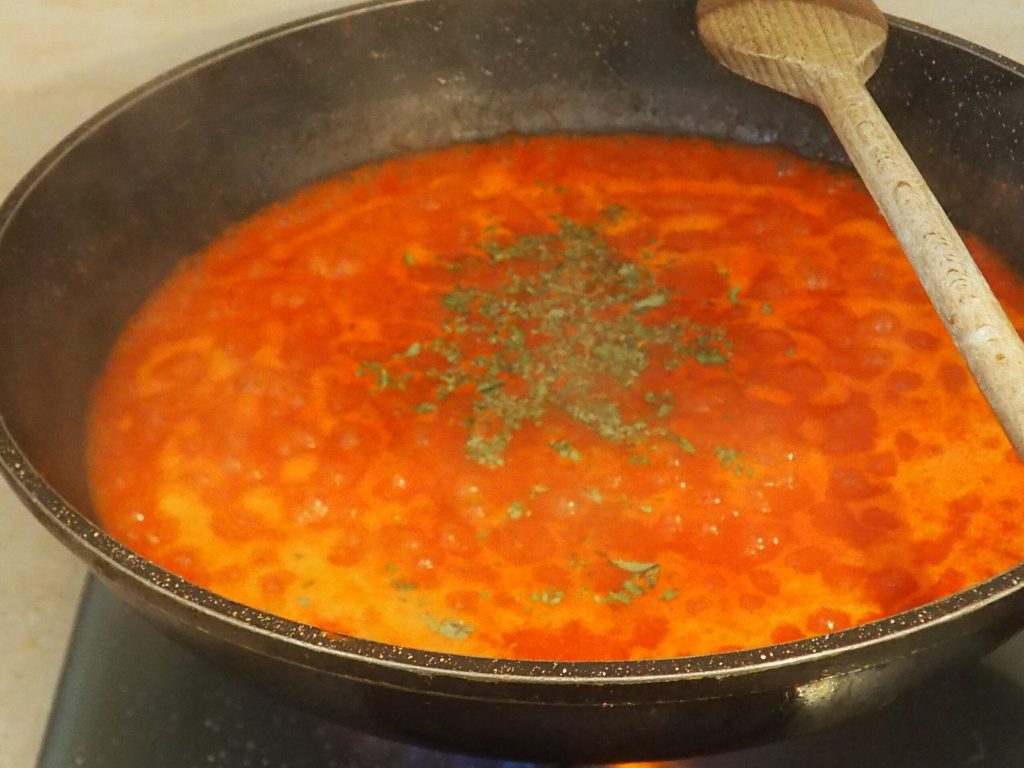Ajoutez maintenant la purée de tomates, le bouillon (vous pouvez choisir entre légumes ou viande), l’origan, le sel fin et le sucre.
