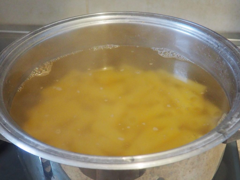 Entre-temps, dans une casserole, mettez une grande quantité d’eau, dès qu’elle bout ajoutez le gros sel et les pâtes. Faites cuire al dente.