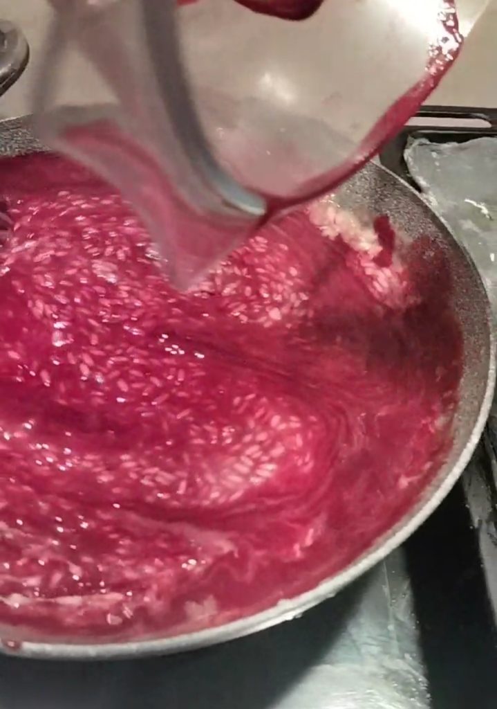 Il ne vous reste plus qu’à ajouter la purée de mûres, remuez et avant de terminer la cuisson, ajoutez 30 gr de beurre, le parmesan, ajustez le sel si nécessaire et servez chaud.