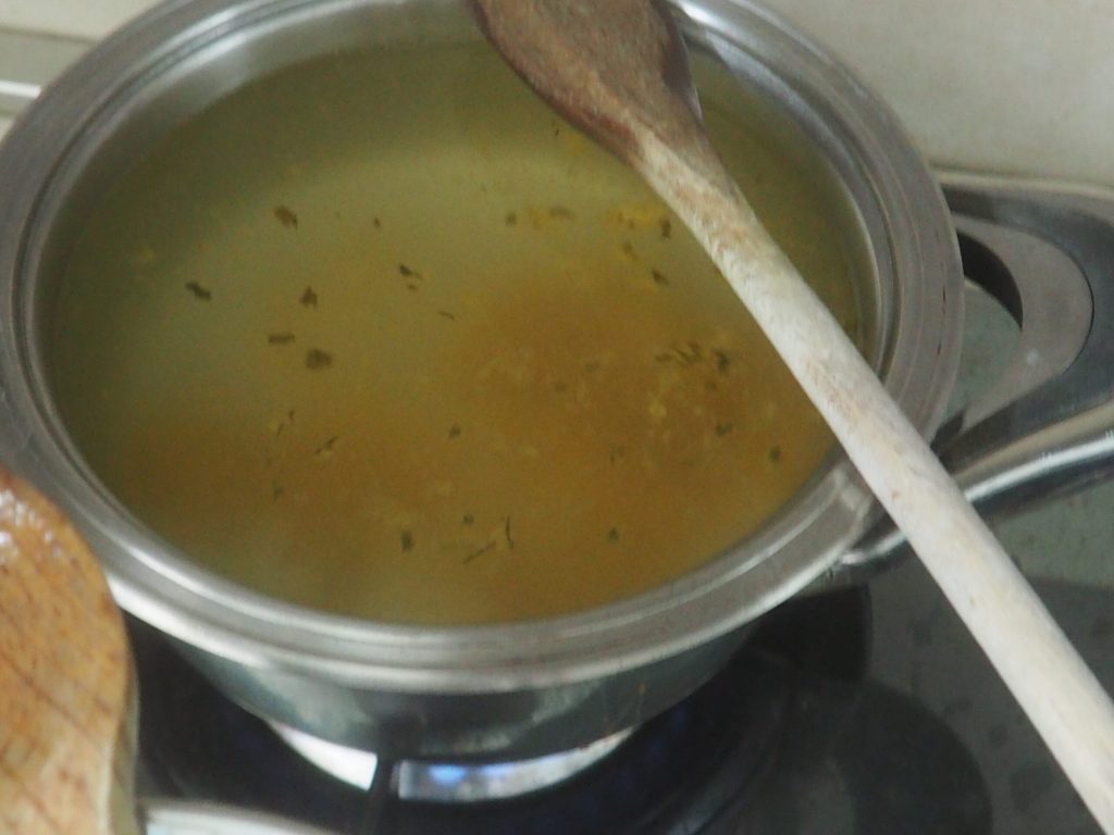 • Préparez le bouillon en mettant un litre d’eau dans une casserole, faites-la chauffer, ajoutez le cube de bouillon, mélangez pour le dissoudre et gardez au chaud.