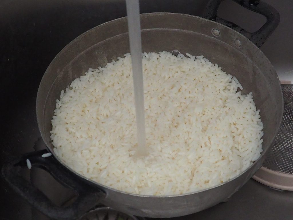 Égouttez le riz et passez-le sous l’eau froide courante.