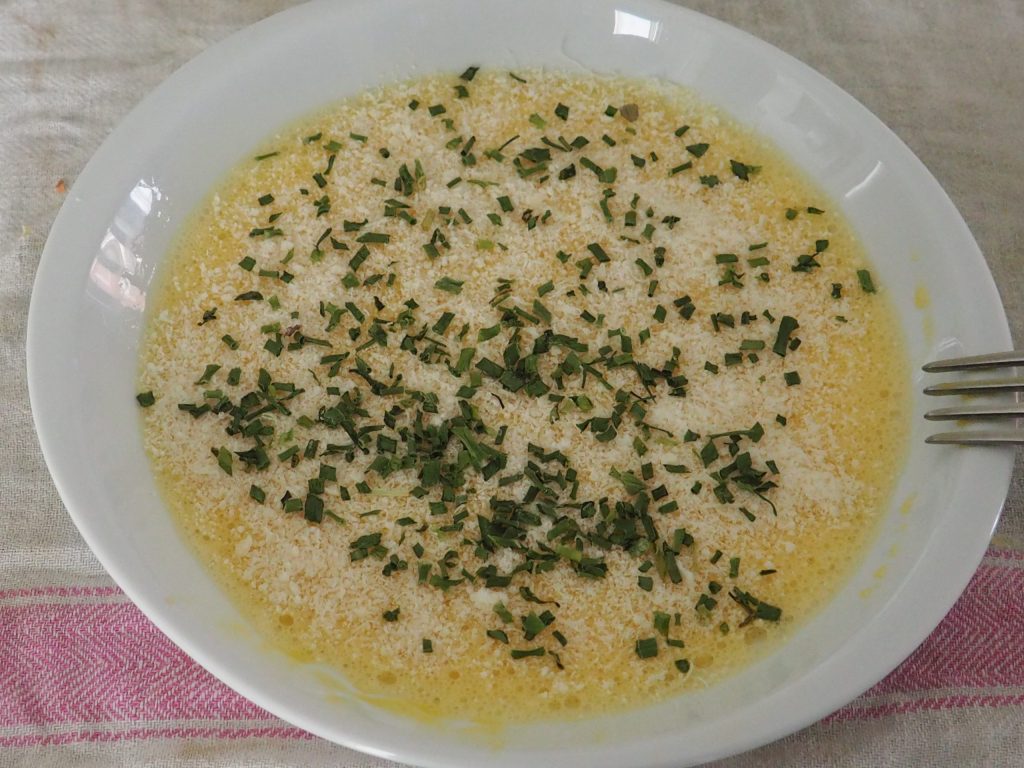 Entre-temps, battez les trois œufs et ajoutez le parmesan râpé, le sel fin et la ciboulette, continuez à battre jusqu’à bien mélanger les ingrédients.