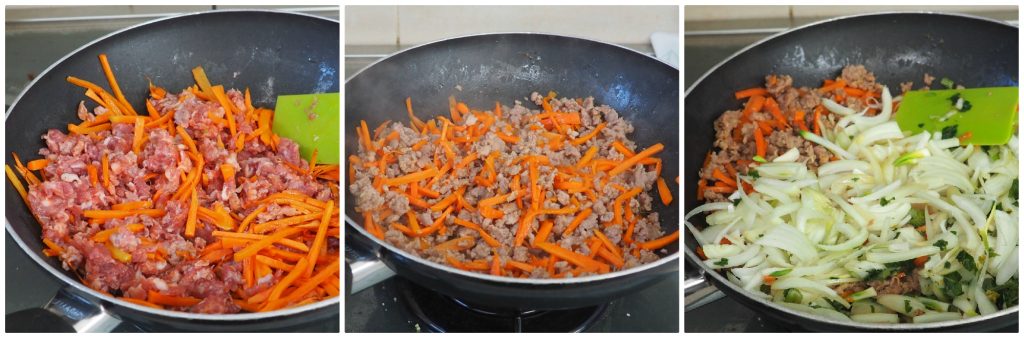 • Ajoutez maintenant la viande, faites-la dorer et ensuite ajoutez les oignons et le céleri.