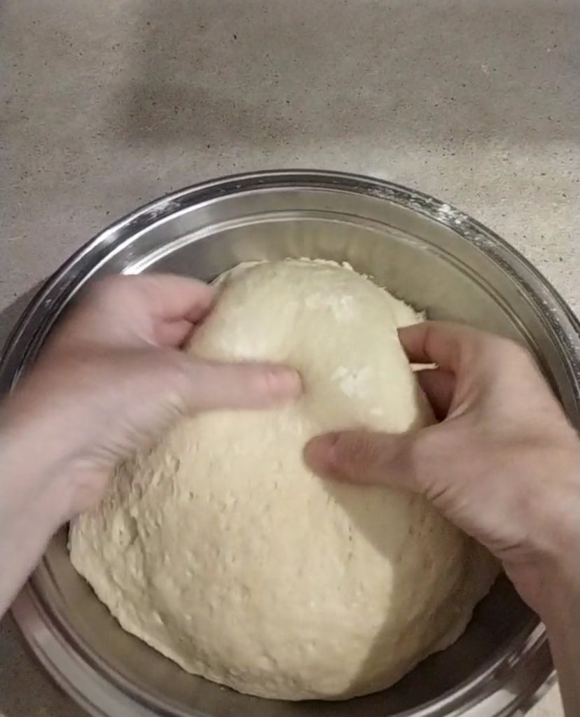 À ce point, mettez la boule dans un saladier fariné, couvrez-la de film plastique, puis d’un torchon propre. Laissez lever dans un endroit à l’abri pour environ deux heures. Elle doit au moins doubler, le temps dépend aussi de la température.