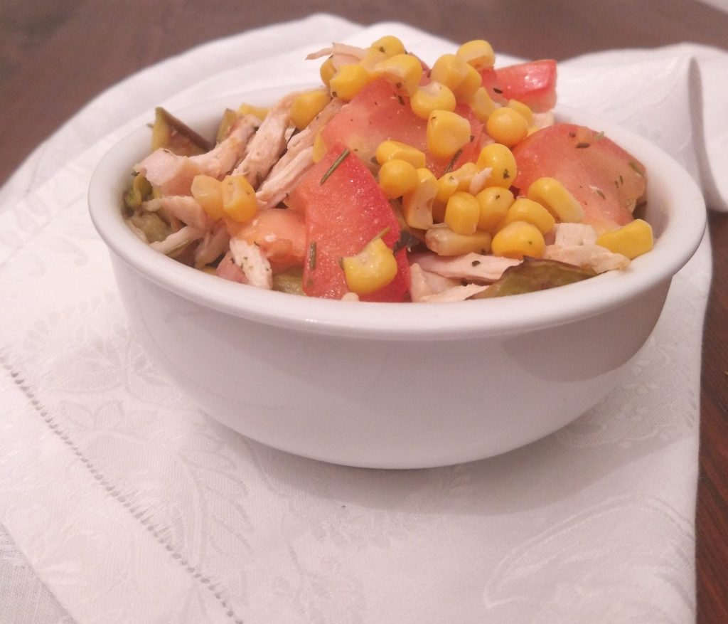 Dans un saladier, mettez les tranches de tomate, le maïs, les courgettes coupées en morceaux et le poulet effiloché.