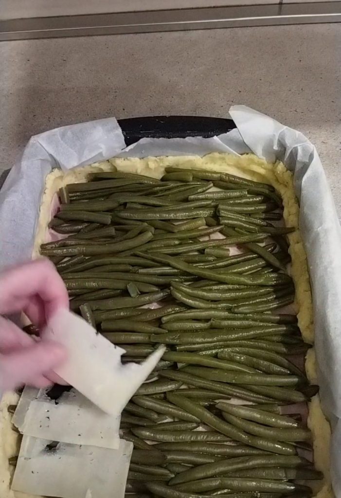 Disposez les haricots verts blanchis sur la couche de jambon (réservez-en 5 ou 6 pour la surface).