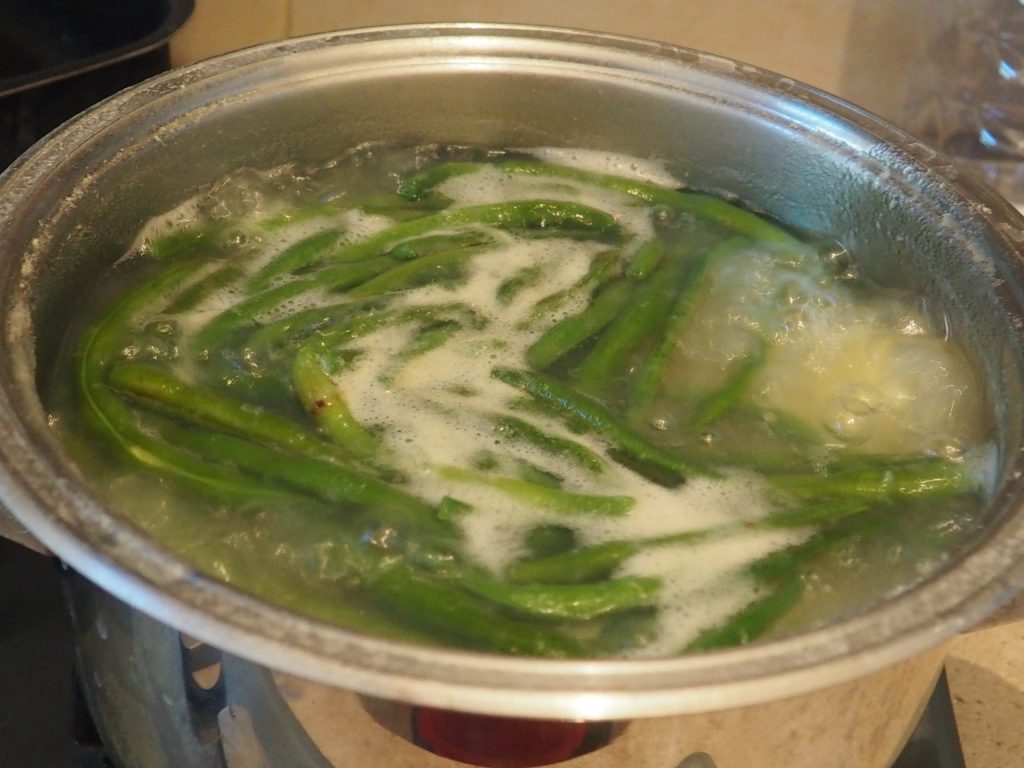Lavez et équeutez les haricots verts. Dans une casserole, mettez abondamment d’eau ; dès qu’elle bout, ajoutez le gros sel et les haricots verts. Faites-les cuire jusqu’à ce qu’ils soient cuits mais encore croquants (cela prendra entre 15 et 20 minutes). Égouttez-les puis mettez-les dans un saladier.