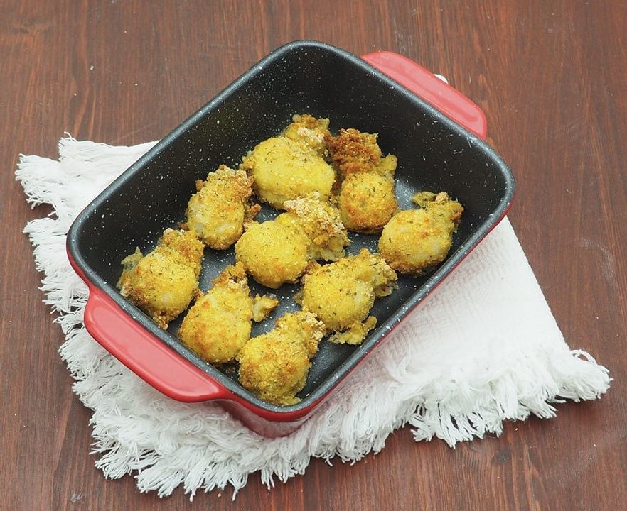 Maintenant, petit à petit, plongez les seiches décongelées dans le mélange d’œufs, laissez-les égoutter puis passez-les dans la chapelure aromatisée.