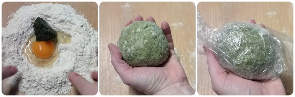 Versez la farine en fontaine sur un plan de travail, ajoutez l’œuf et les épinards (préalablement bouillis et mixés avec un mixeur plongeant pour les réduire en purée). Pétrissez jusqu’à obtenir une pâte lisse et homogène, facile à travailler. Enveloppez le pâton dans un film plastique et laissez-le reposer une demi-heure.