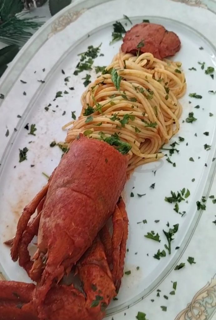 Les Spaghetti à la sauce de homard sont certainement un plat coûteux, mais ils peuvent être une idée savoureuse et impressionnante à proposer lors des fêtes à vos invités. Je les trouve délicats et en même temps avec un goût unique. Pour préparer la sauce, je vous conseille d’utiliser aussi la tête et le corps du homard, cela sera plus savoureux, bien sûr vous devrez les retirer avant de servir les pâtes. Si vous avez le temps, vous pouvez préparer des tagliatelles maison, cela donnera un plus à votre plat.