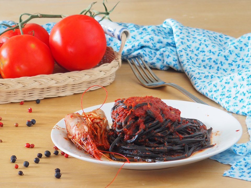 Spaghetti à l’encre de seiche avec sauce aux gambas