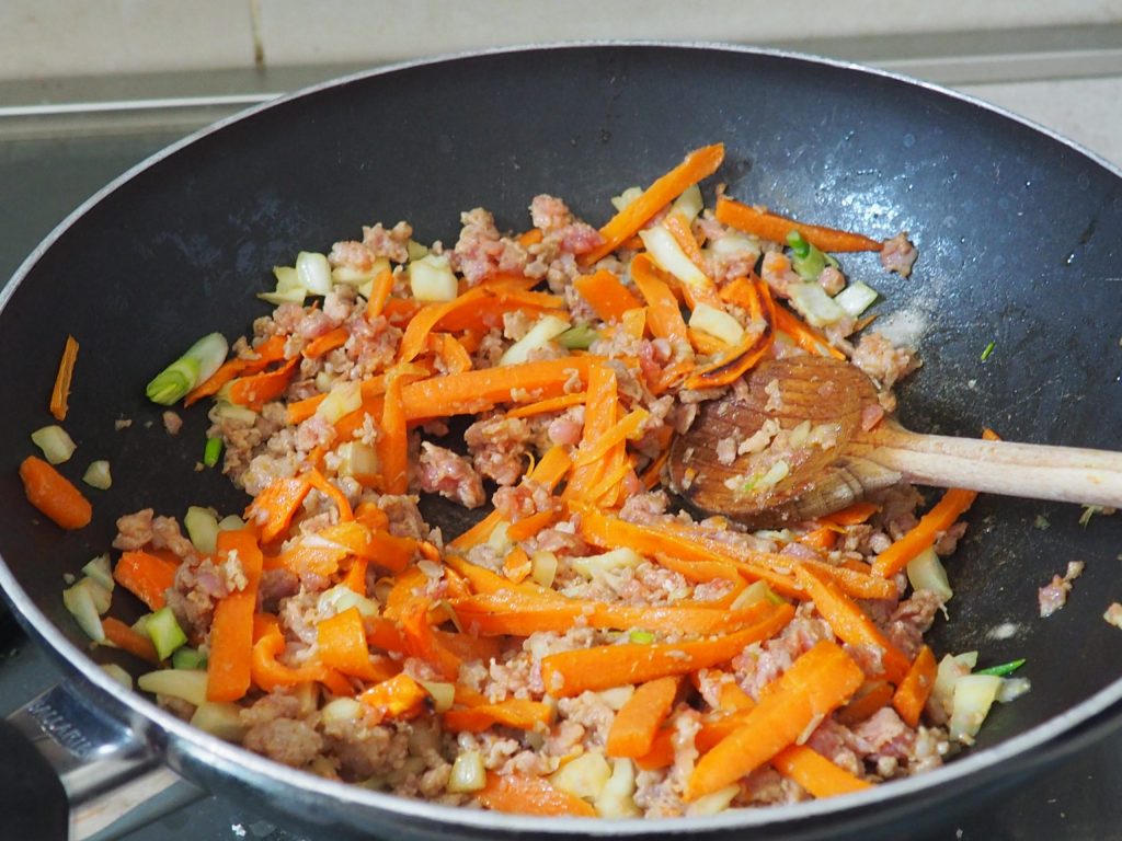 Dans un wok, mettez l’huile et la carotte, faites cuire pendant quelques minutes.