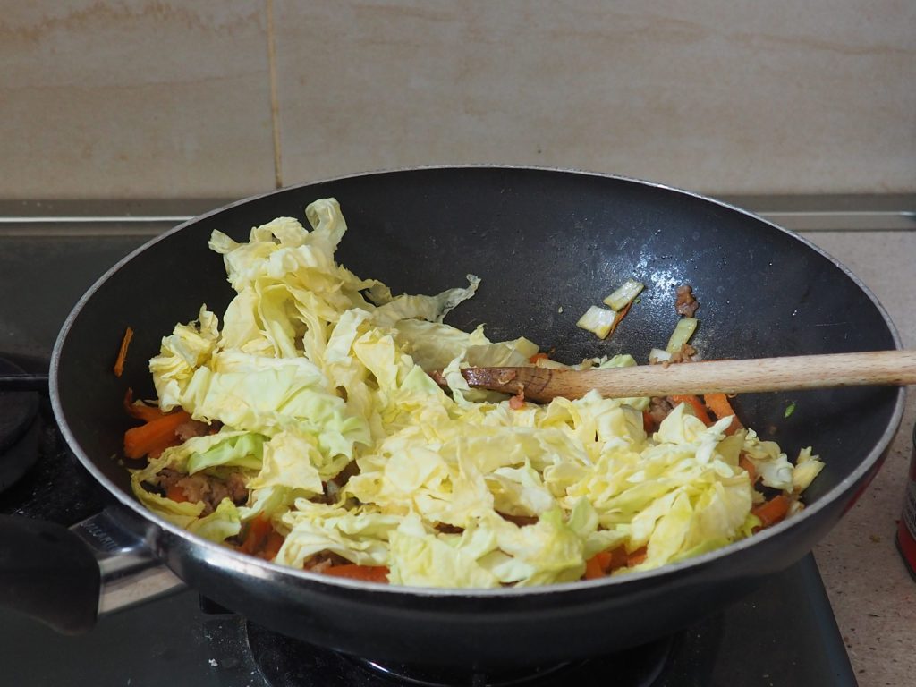 Ajoutez maintenant le chou, les pousses de bambou, la sauce soja, mélangez bien et faites cuire pendant 20 minutes supplémentaires.