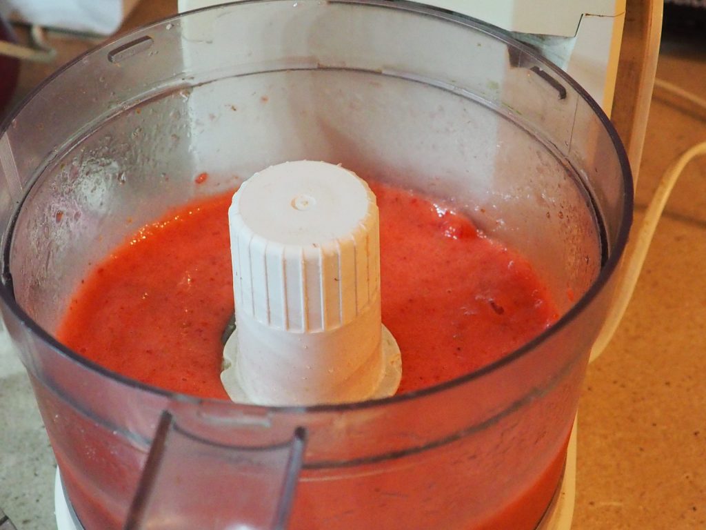 Préparez les fraises : lavez-les, équeutez-les, coupez-les en deux ou quatre selon leur taille, et laissez-les macérer dans une petite casserole avec le sucre et le citron pendant une demi-heure. Mettez-les dans un mixeur et mixez-les jusqu’à obtenir une purée.