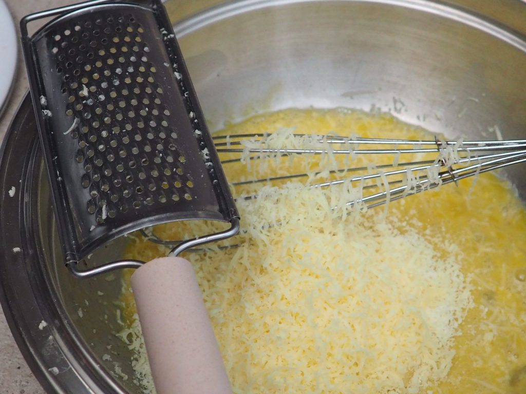 Pendant ce temps, mettez dans un bol les œufs, le parmigiano et l’emmenthal râpés, mélangez bien avec un fouet.