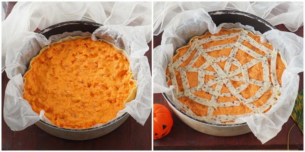 Couvrez un moule de 28 cm de diamètre avec du papier sulfurisé, posez dessus la pâte feuilletée et mettez à l’intérieur le mélange de citrouille, lard et mascarpone.