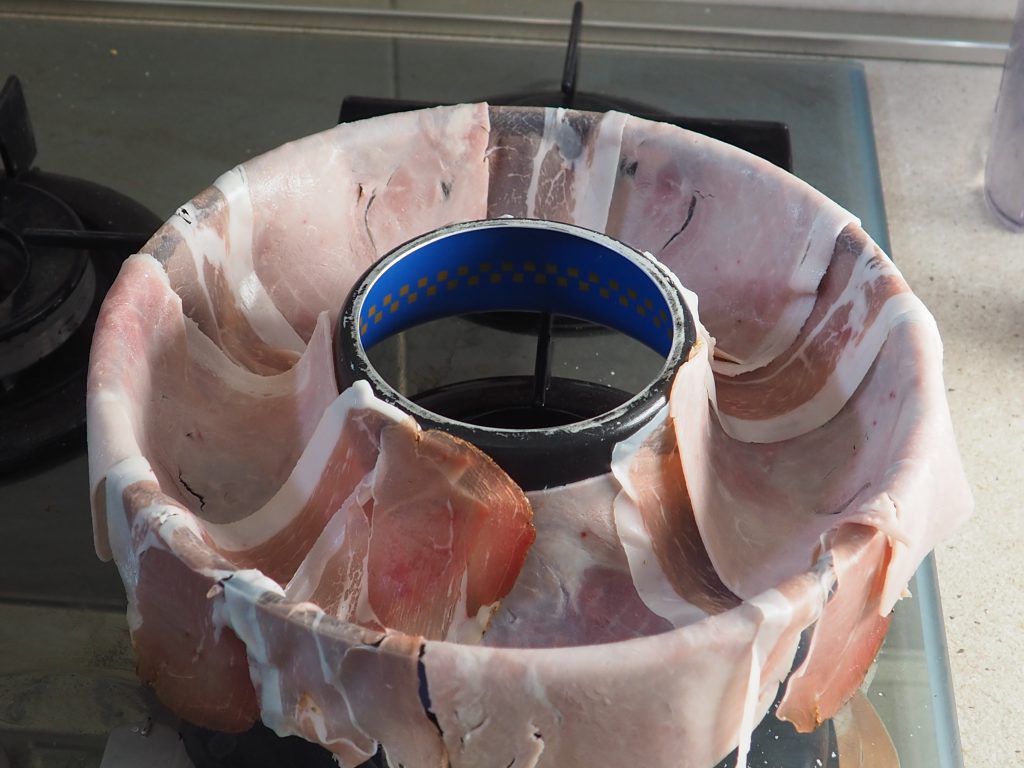 Vaporisez un moule à couronne de 24 cm avec du beurre fondu, tapissez-le en alternant les tranches de jambon cuit et celles de speck.
