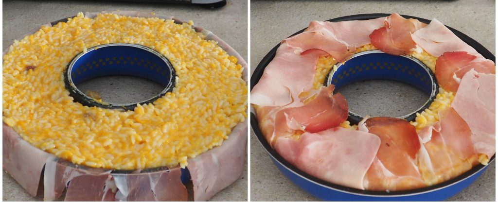 Couvrez le tout avec le reste de riz puis refermez avec les tranches de jambon et de speck.