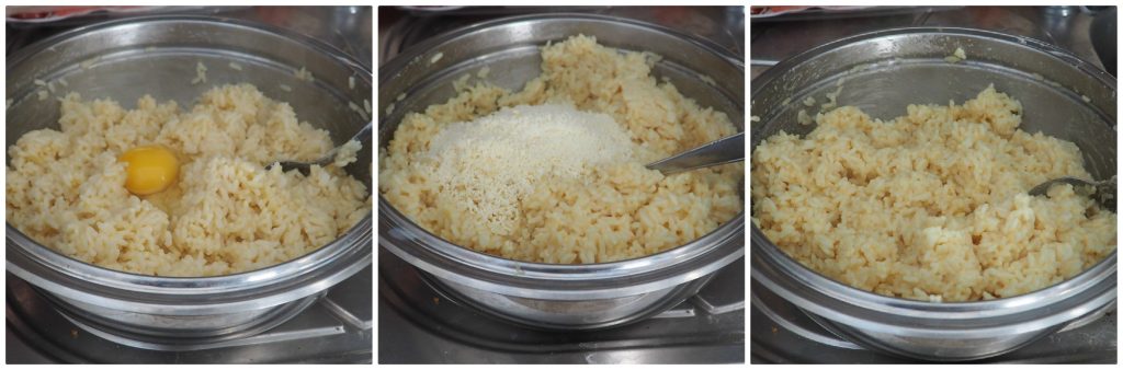 Retirez le riz de la casserole et mettez-le dans un grand bol. Laissez-le refroidir légèrement et ajoutez les œufs un par un, en les mélangeant bien. Ensuite, ajoutez le parmigiano et mélangez pour bien répartir les ingrédients.
