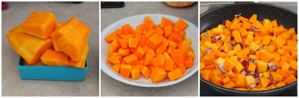 Nettoyez la courge, enlevez la peau (j’utilise un épluche-légumes), coupez-la en petits dés pour qu’elle cuise plus rapidement.