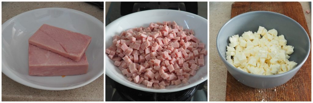 Coupez le jambon cuit et la mozzarella en cubes et mettez-les dans une assiette