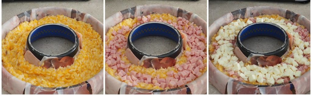 Mettez maintenant la première couche de riz, faites un petit creux et ajoutez le jambon en dés puis la mozzarella.