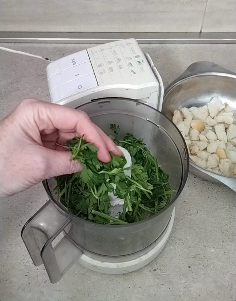 Lavez et nettoyez le persil, vous pouvez utiliser uniquement les feuilles ou également les tiges, même si elles sont un peu plus dures à moins que vous n’ayez un robot de cuisine assez puissant. Vous pouvez réaliser le bagnetto verde en hachant les ingrédients à la main ou, pour accélérer le processus, utiliser le mixeur comme je l’ai fait.