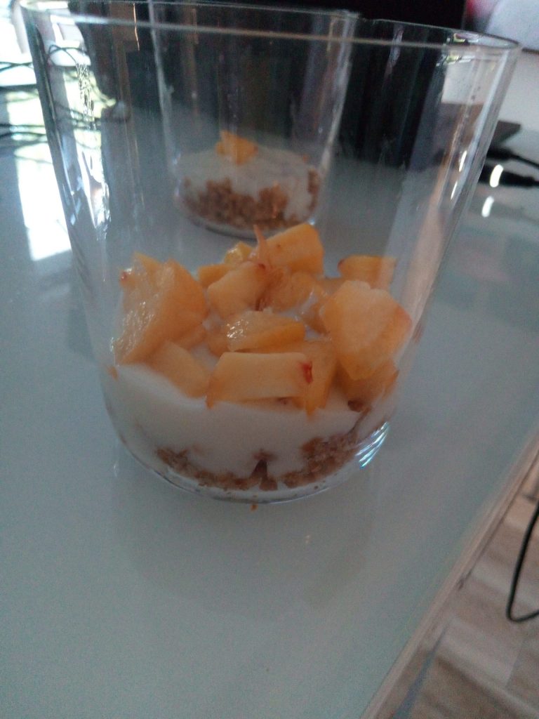 Faites à nouveau une couche de cantuccini, une de yaourt et la couche finale de pêches.