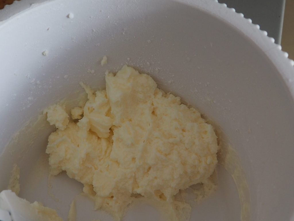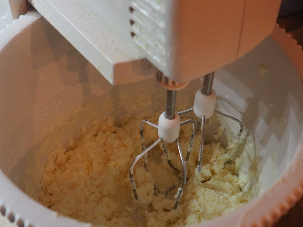 Dans un mixeur avec fouets, montez le beurre et le sucre, travaillez-les jusqu’à obtenir une préparation mousseuse. Si vous préférez, vous pouvez aussi utiliser une fourchette puis une spatule.