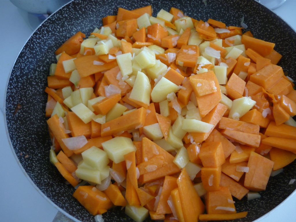 Dans une poêle, chauffons 4 cuillères d’huile d’olive, ajoutons l’oignon haché et faisons revenir, coupons la citrouille et les pommes de terre en cubes et mettons-les dans la poêle. Faisons revenir pendant quelques minutes, ajustons le sel et le poivre et ajoutons les herbes.