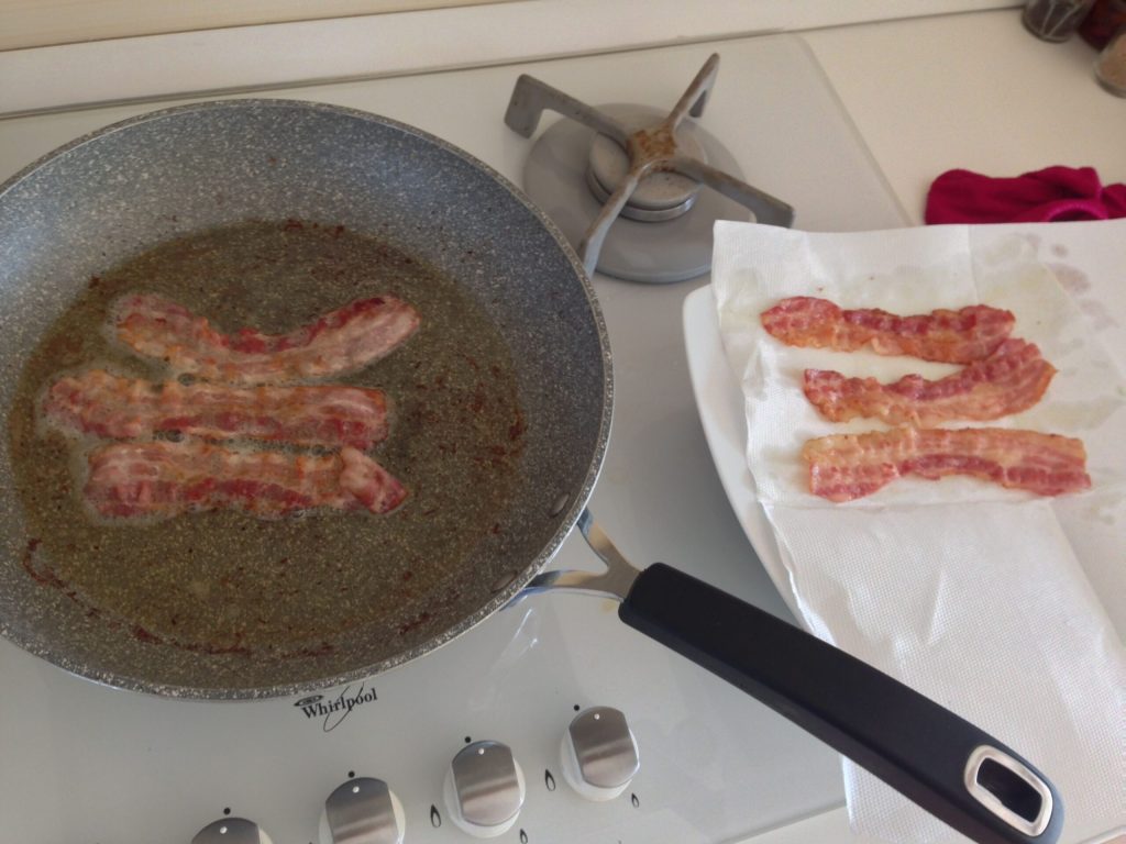 Mettez une poêle anti-adhésive à chauffer, faites-la devenir bien chaude et ajoutez la noix de beurre. Dès que le beurre fond, ajoutez les tranches de bacon, faites-les dorer quelques minutes de chaque côté jusqu’à ce qu’elles deviennent croustillantes. Retirez-les de la poêle et posez-les sur du papier absorbant pour éliminer l’excès de graisse et les garder croustillantes.