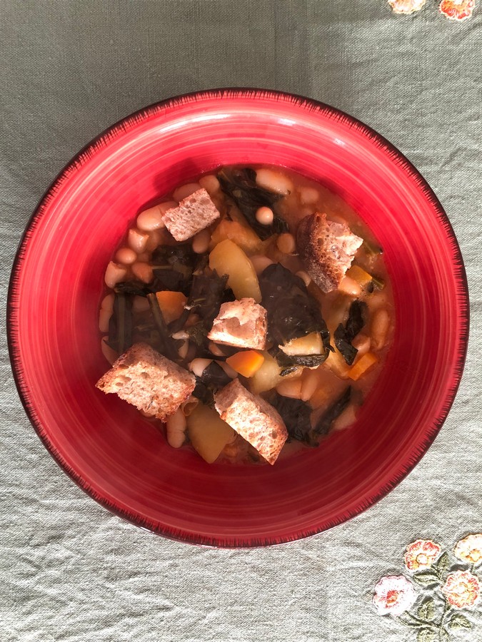 Le chou noir est typique de la cuisine toscane, en effet il est aussi appelé chou toscan, feuille longue, couleur vert foncé presque noir. Dans la cuisine toscane, il est surtout utilisé dans la ribollita, mais nous en ferons une soupe pour un plat unique, complétée avec des croûtons de pain de campagne.