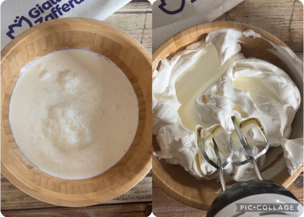 Dans un grand bol, nous montons la crème froide avec le sucre glace et le lait concentré jusqu’à obtenir un mélange épais et mousseux.