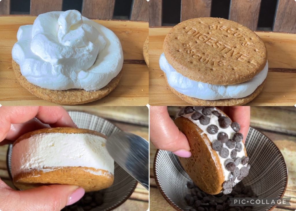 Cette recette me ramène directement à mon enfance, lorsque j’adorais les biscuits glacés. Il suffisait de les voir dans le congélateur du café en bas de chez moi pour que mes yeux brillent : deux biscuits croquants avec une crème froide et très sucrée à l’intérieur, souvent avec des pépites de chocolat sur les côtés. C’était l’une des choses que j’attendais le plus pendant l’été.