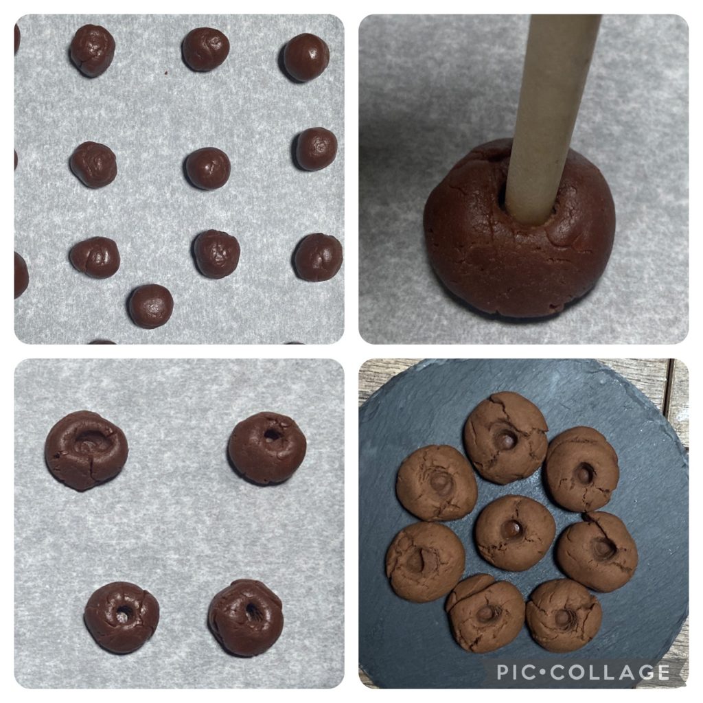 • Avec l’aide du manche d’une cuillère en bois, faisons un trou au centre de chaque biscuit.