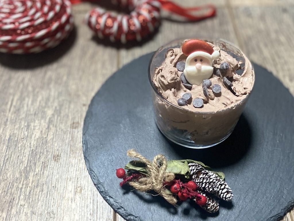 • Notre crème au mascarpone et chocolat est prête. Nous la servons dans des coupes individuelles et décorons avec des pépites de chocolat et des décorations sucrées de Noël!